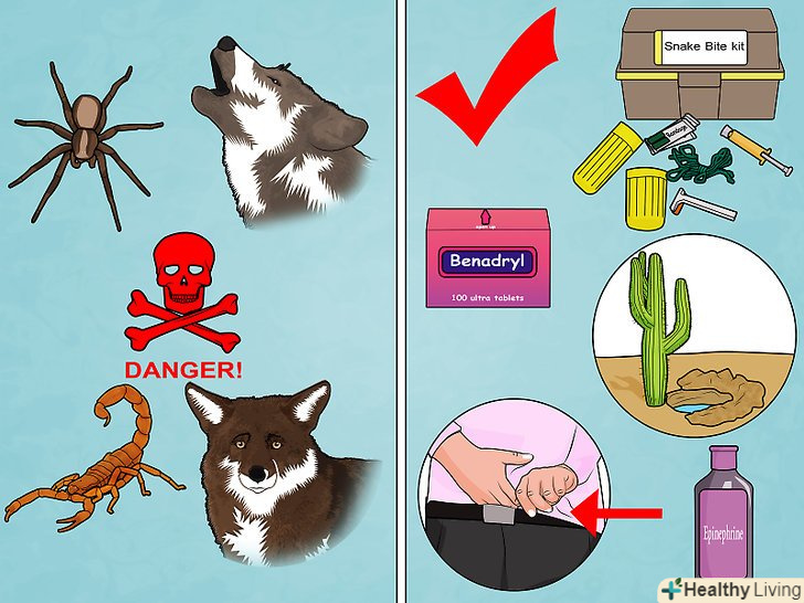 Остерігайтеся небезпечних тварин. більшість ссавців і рептилій самі будуть триматися від вас подалі, особливо якщо вони одні. Дотримуйтеся тієї ж лінії поведінки і будьте обережні, щоб випадково не зіткнутися з будь-якою твариною. При можливості заздалегідь дізнайтеся про дику фауну даного регіону, щоб бути готовим до можливих зустрічей з її представниками.- Перш ніж просунути руку в будь-яке затишне місце (наприклад, під купу каменів), обов'язково потикайте в нього палицею. У подібних місцях можуть ховатися скорпіони, павуки або змії.