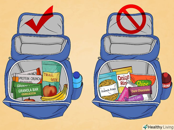 Візьміть з собою поживну їжу, яка не важка і займає мало місця. добре підійдуть енергетичні батончики, пеммікан (м'ясний концентрат), в'ялене м'ясо або суміш із сухофруктів і горіхів. Заздалегідь проведіть експеримент, щоб дізнатися, що вам краще підходить. Якщо машина зламається і ви будете змушені пішки добиратися до найближчого населеного пункту, вам доведеться взяти з собою лише найнеобхідніше.- Візьміть з собою продукти з сіллю і калієм — ці речовини виводяться з організму разом з потом. Це допоможе вам уникнути теплового виснаження і зберегти більше води. Однак при зневодненні зайва сіль може погіршити ваш стан.