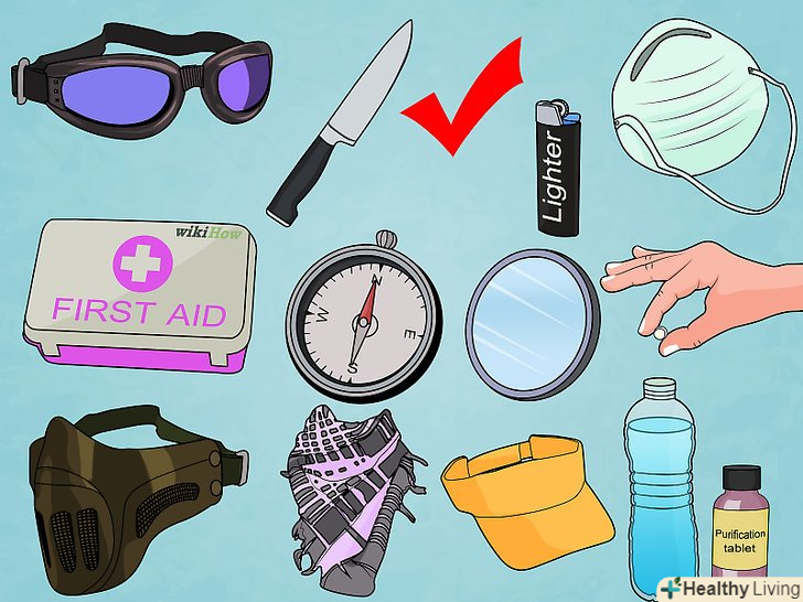 Запасіться речами та інструментами, які необхідні для виживання. вам знадобиться наступне: [6]- Міцні рятувальні ковдри