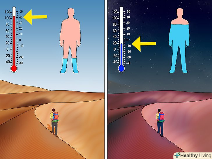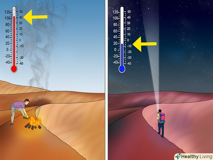 Намагайтеся пересуватися вночі. у разі надзвичайної ситуації в пустелі краще не пересуватися вдень. У прохолодне нічний час ви зможете пройти далі і уникнете небезпеки теплового удару. У жаркому кліматі така проста тактика дозволить вам зберігати до трьох літрів води на добу. [7]