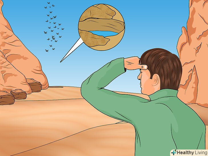 Знайдіть джерело води. якщо недавно пройшов дощ, вода могла залишитися під камінням і в тінистих місцях. Однак частіше доводиться шукати виходять на поверхню джерела підземних вод:- Слідуйте по провідних вниз слідах тварин, звертайте увагу на кружляють над чимось птахів і навіть літаючих комах.