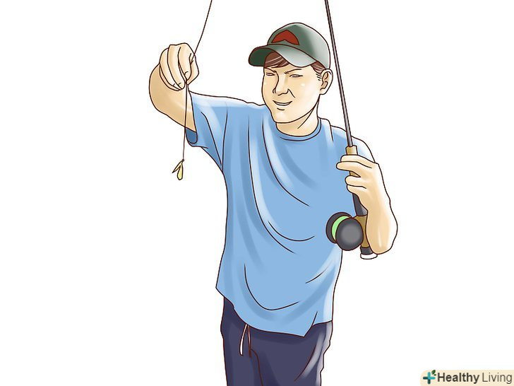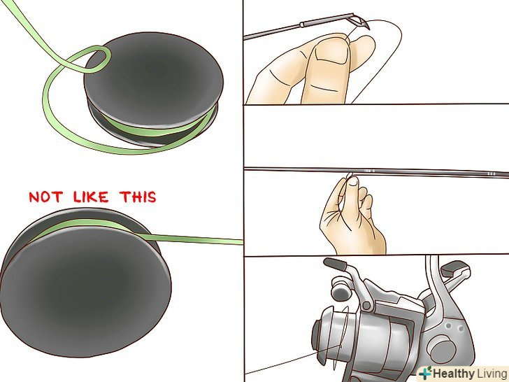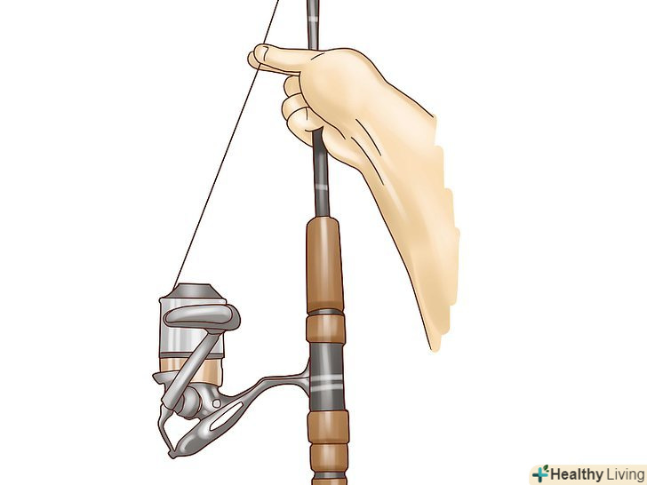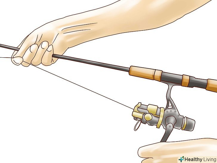 Тримайте волосінь між пальцями на відстані близько 2,5 см перед котушкою, в той час як ви повертаєте ручку, щоб намотати волосінь на котушку. через кілька секунд опустіть вудку в сторону котушки. Якщо волосінь перегинається і крутиться, поверніть котушку так, щоб розмітка була звернена до підлоги і почніть все заново. Якщо волосінь закручується, це нормально для створення великих петель.