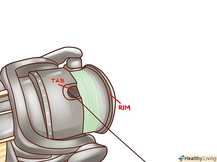 Покладіть котушку на підлогу і промаркуйте її. пропустіть волосінь через кільця вудки до котушки з відкритою петлею і прив'яжіть щільно до котушки. Якщо ви будете постійно використовувати квадратний вузол зверху вниз, перекидаючи кінець два рази, а не один, це допоможе зберегти волосінь в котушці щільно закрученою. Закрийте петлю.