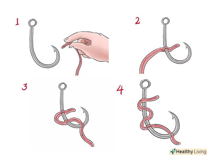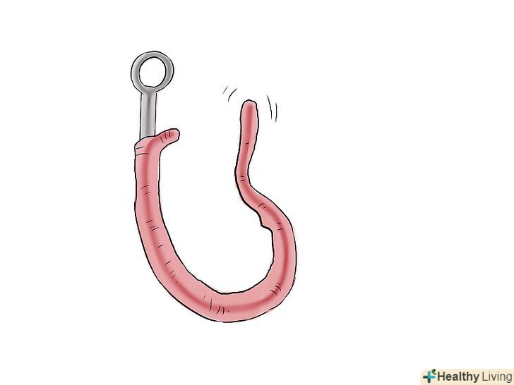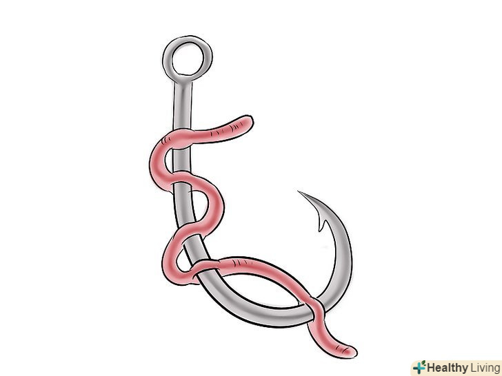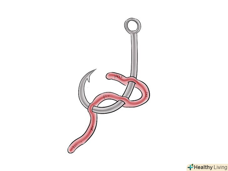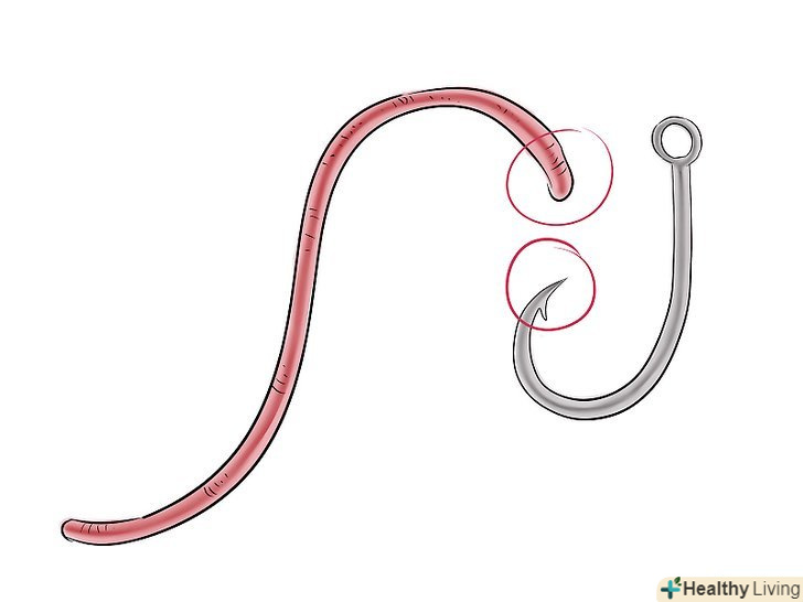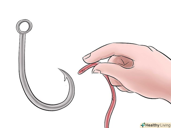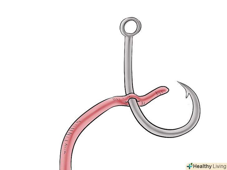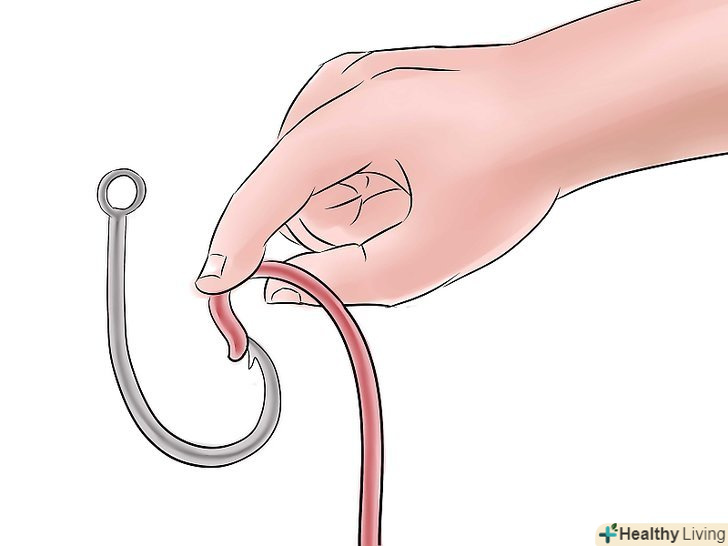 Встроміть загострений кінець гачка в хвіст черв'яка так, щоб він пройшов наскрізь. позначте місце близько 5 мм від одного кінця черв'яка. Якщо проткнути дуже близько до голови черв'яка, то він зможе злетіти з гачка. Чи не проткніть свою руку, поки проколюєте тіло черв'яка наскрізь - не натискайте паралельно загостреному кінця гачка.- Не потрібно гидувати! Хоча черв'як може звиватися і кидатися при насаджуванні, вчені вірять, що черв'яки не відчувають болю. [1]