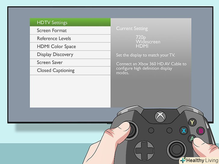 Підключіть Xbox 360 до телевізора високої роздільної здатності (HDTV). такий телевізор повинен відтворювати зображення у форматі 720p і більше. Ви не зможете грати на розділеному екрані на старому телевізорі зі стандартною роздільною здатністю.- Консоль повинна бути підключена до телевізора через компонентний кабель (5-контактний) або HDMI-кабель. [1]