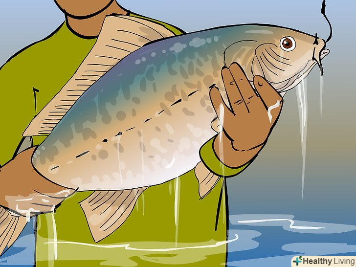 Пам'ятайте, що якщо у вас немає сітки, не тягніть його за губи, як окуня. це важко і ви можете відірвати рибі щелепу. Однією рукою візьміть його знизу. перед хвостом, а інший між головою і животом. Тримайте його міцно, але не стискайте. Якщо це сом, вам можливо доведеться витягувати його з води руками.