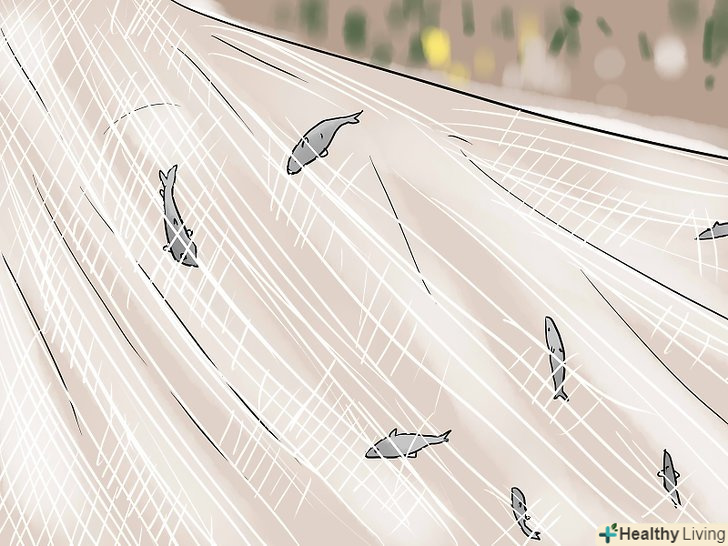 Подумайте про лов мережею. якщо ви хочете зловити рибу поменше для наживки, ви можете використовувати мережу. Щоб ловити мережею, вам потрібно, щоб осередки мережі підходили для риби, яку ви ловите. Маленька риба прослизне через великі осередки сітки. Стандартна сітка йде площею 2 метри, вага її 227 грам, з осередками 1.3 см.- Підготуйте сітку заздалегідь. Щоб її було зручніше кидати, і вона швидше тонула, замочіть її на ніч в пральній машині або тазику з теплою водою і кондиціонером для білизни. Потім на день розкладіть її на сонці. Коли вона висохне, вона стане більш гнучкою і легкою у використанні.