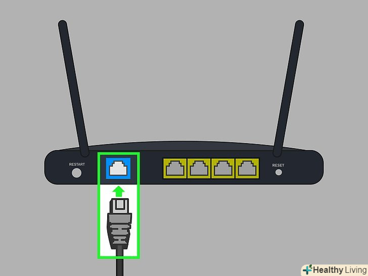 Підключіть маршрутизатор до модему. просто вставте Ethernet-кабель в роз'єм на задній панелі маршрутизатора.- Якщо маршрутизатор і модем є одним пристроєм, пропустіть цей крок.