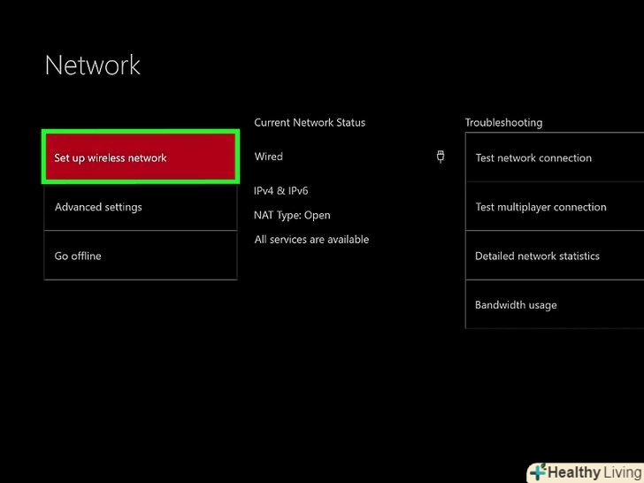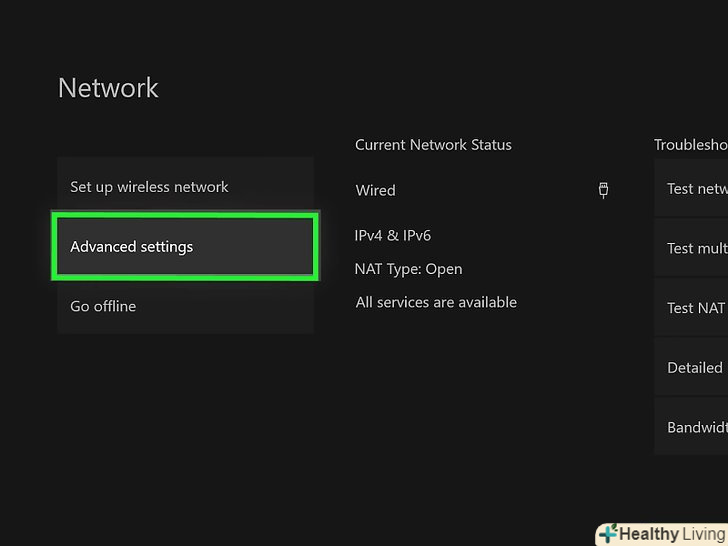 Перейдіть на вкладкуМережа і виберіть Параметри мережі , а потім натисніть A . відкриються мережеві налаштування Xbox One.