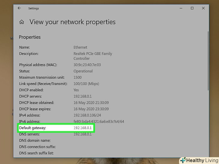 Визначте IP-адресу маршрутизатора. щоб змінити тип NAT на "відкритий", перейдіть на сторінку конфігурації маршрутизатора. Ваші дії будуть залежати від операційної системи:- У Windows відкрийте меню «Пуск», натисніть «Параметри» gt; «Мережа та інтернет» gt; «Параметри мережі» і знайдіть IP-адресу в рядку «Основний шлюз».