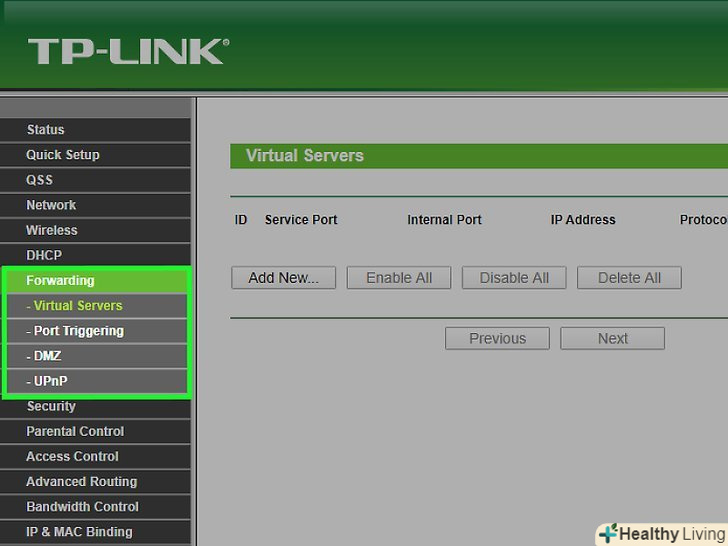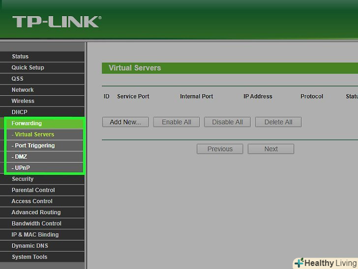Перейдіть в розділ «Port Forwarding» (переадресація портів). якщо вам не вдається знайти його, введіть в пошукову систему модель свого маршрутизатора, щоб отримати точні інструкції.