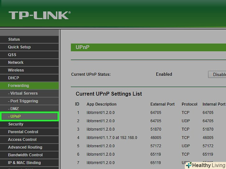 Знайдіть Налаштування UPnP. майте на увазі, що інтерфейс сторінки конфігурації залежить від моделі маршрутизатора.- «UPnP "означає" Universal Plug and Play", тому шукайте однойменний розділ.