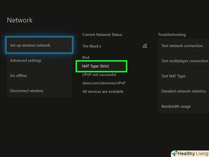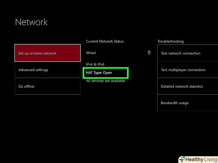 З'ясуйте тип NAT. знайдіть рядок «Тип NAT» (NAT Type) — якщо в ній є слово «строгий» (strict) або «помірний» (moderate), перейдіть до наступного розділу цієї статті.- Якщо ви бачите слово «відкритий» (open), проблеми з Xbox LIVE не пов'язані з типом NAT. Спробуйте зв'язатися зі своїм інтернет-провайдером або усунути неполадки в мережі самостійно.