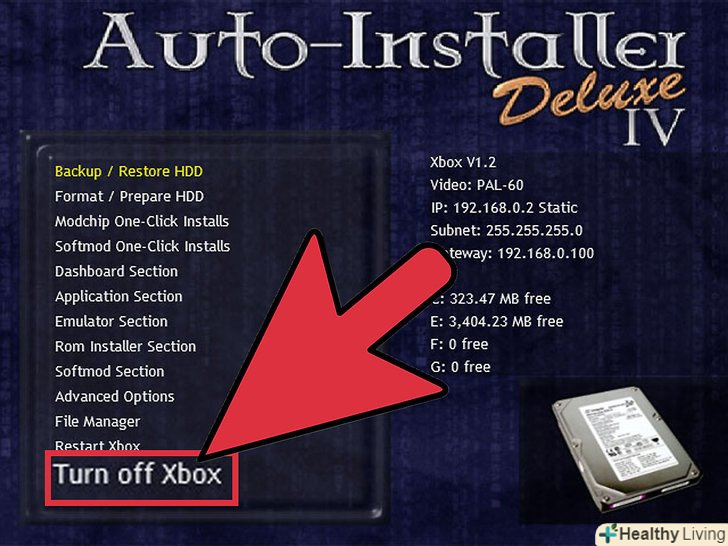 Вимкніть Xbox.після установки нової прошивки, вам необхідно вимкнути консоль і включити її знову. Якщо установка пройшла успішно, то ви побачите нову кастомну прошивку, замість стандартної для Xbox.