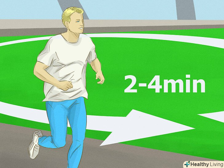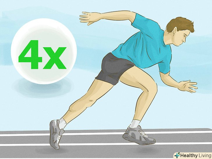 Перші забіги повинні бути короткими. чотирьох спринтів цілком достатньо для першого забігу. Вам може здатися, що цього мало, але якщо ваш організм не звик до подібних навантажень, перевантаження можуть привести до проблем зі здоров'ям. [7]- Після декількох тренувань Ви зможете потроху збільшувати кількість забігів, в кінцевому рахунку, дійшовши до 8-9, в залежності від рівня вашої фізичної підготовки і необхідних показників.