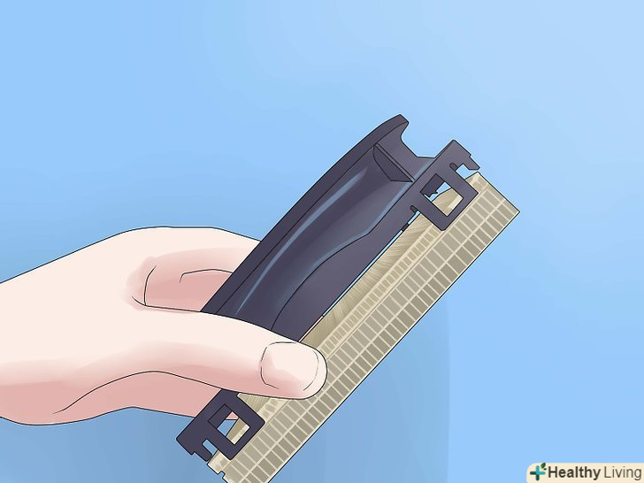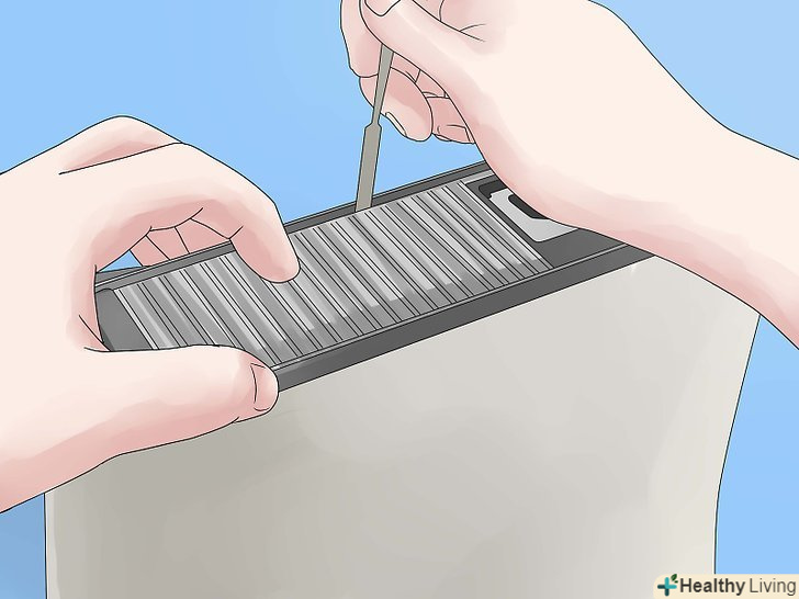 Зніміть нижню решітку.на білій пластмасі під вентиляційними отворами розташовані 6 гачків, що утримують решітку. За допомогою маленької викрутки або комплекту для відкриття корпусу по одному розімкніть ці гачки і акуратно зніміть нижню решітку. Почніть з передньої сторони, там, де знаходиться лицьова панель, так як в цьому місці буде зручніше взятися за грати, щоб підняти її.