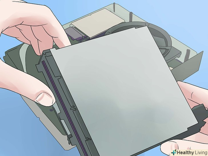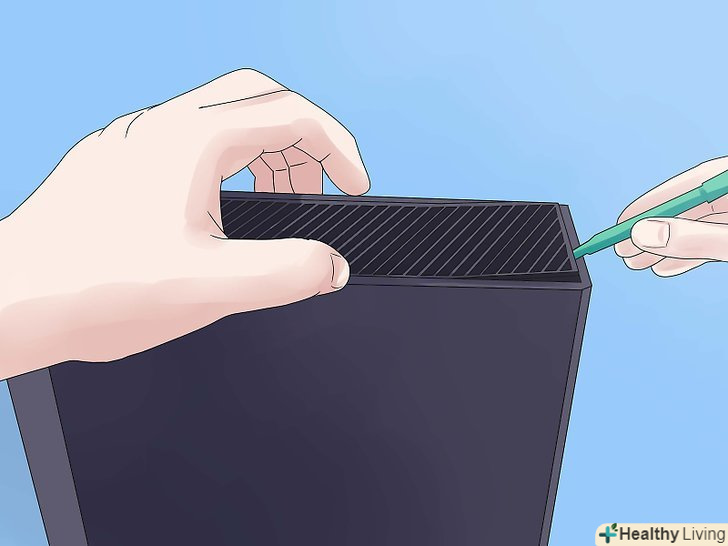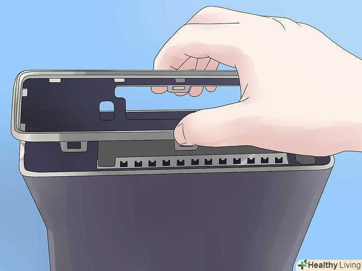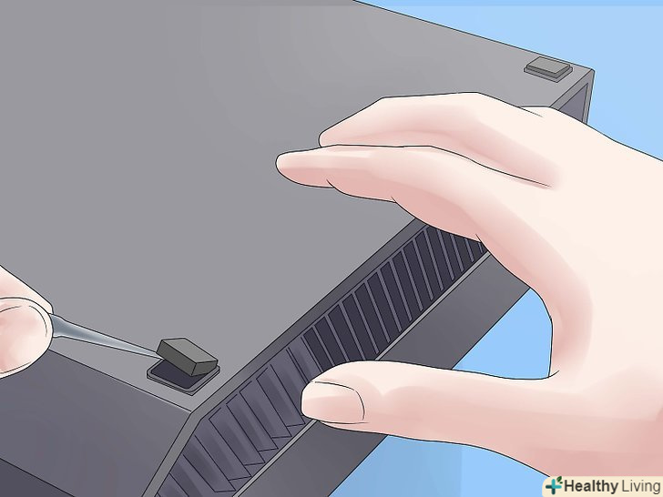 Зніміть верхню решітку.спочатку витягніть жорсткий диск, якщо ви цього ще не зробили. Зверніть увагу, що з одного боку решітки є виступ. Для початку вам потрібно буде розімкнути два гачка на краю виступу. Потім розімкніть два гачка з бічної сторони, там же, де і у нижньої решітки. Останній гачок захований під однією з гумових ніжок. У цього гачка є печатка, відсутність якої означатиме, що Ви порушили умови гарантії.