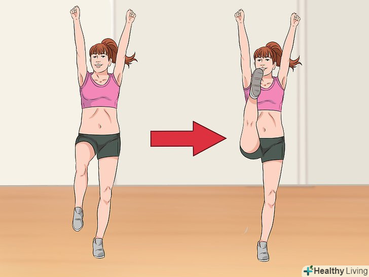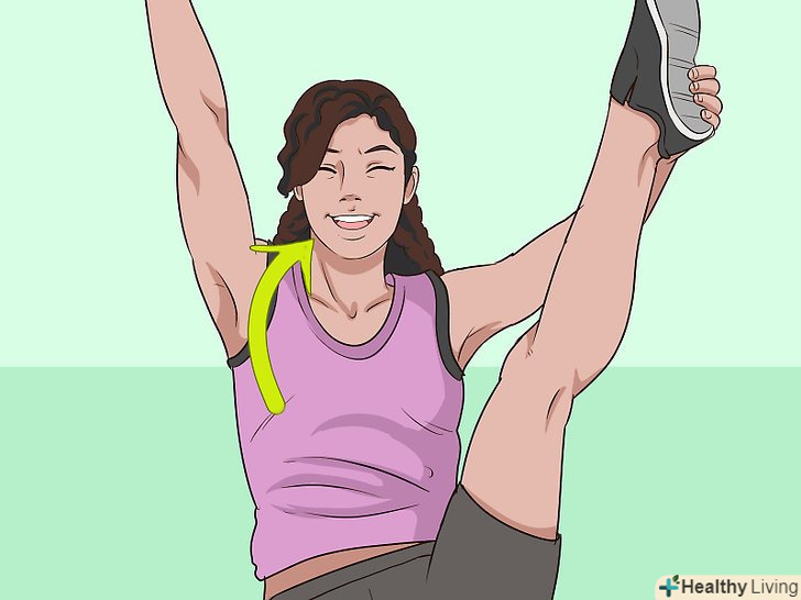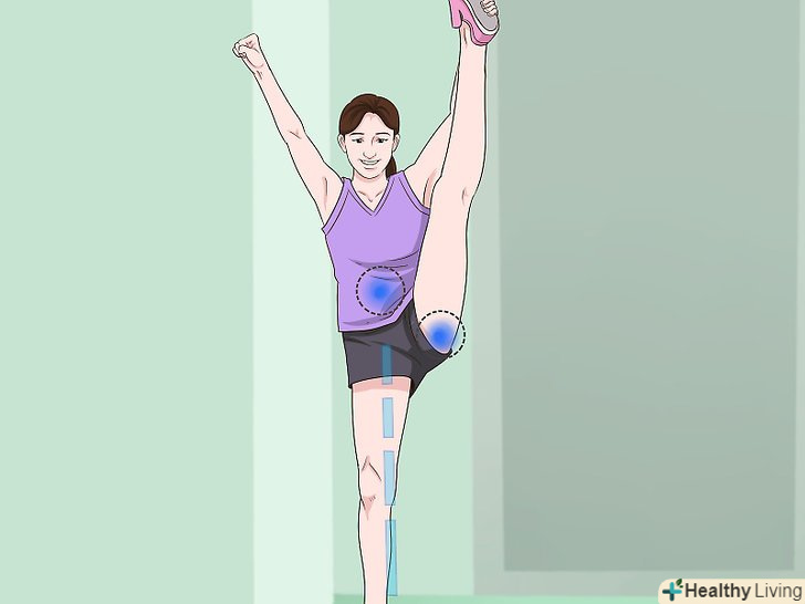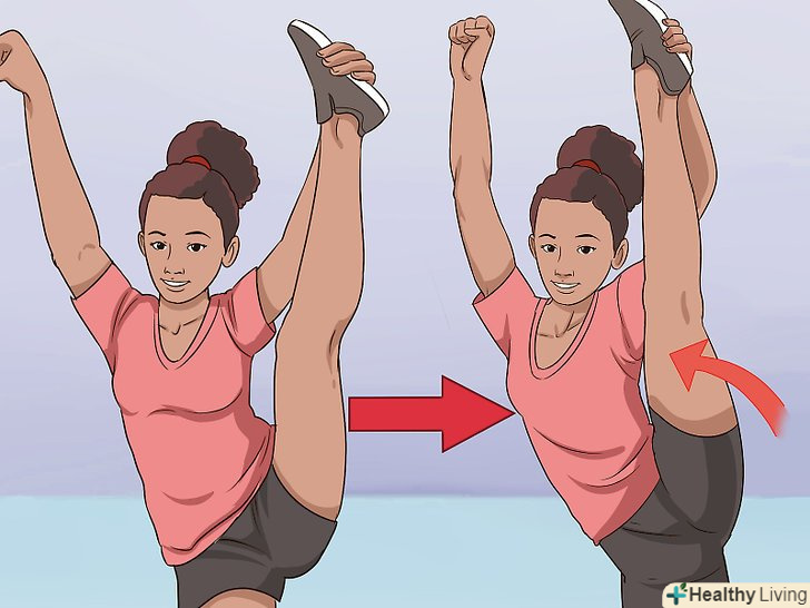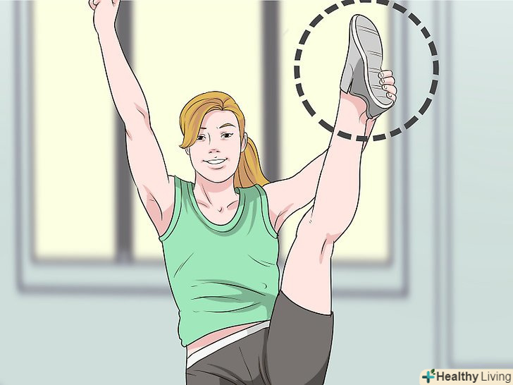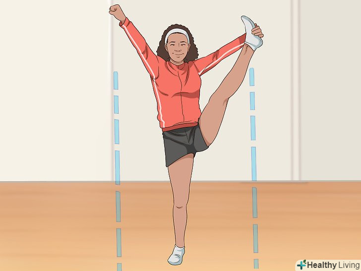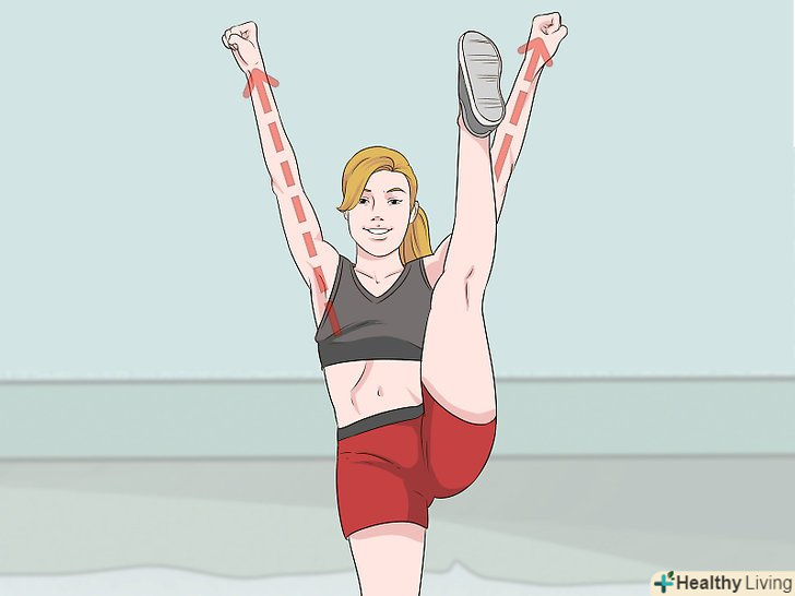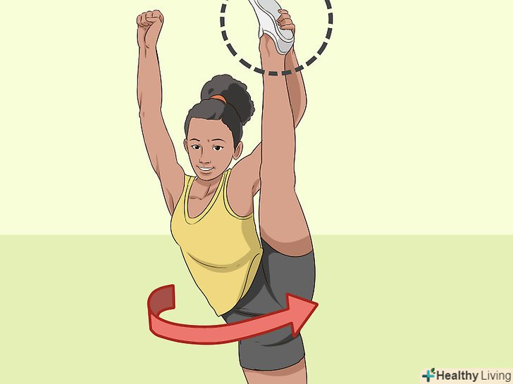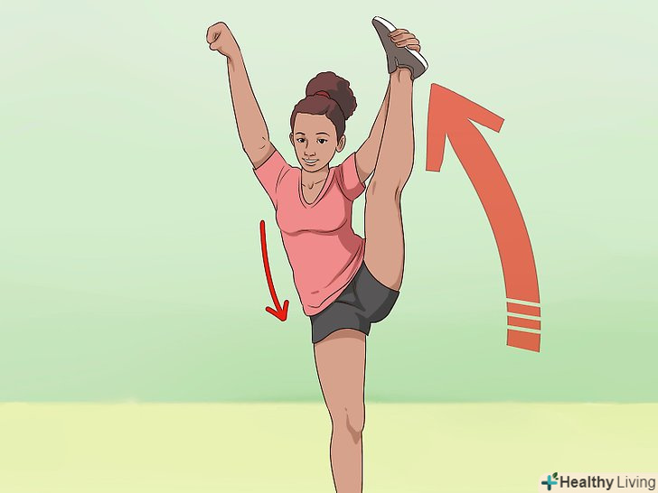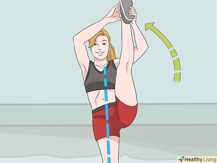 Закиньте ногу вгору. зведіть обидві ноги, випряміть їх, а потім закиньте одну ногу вгору якомога вище.