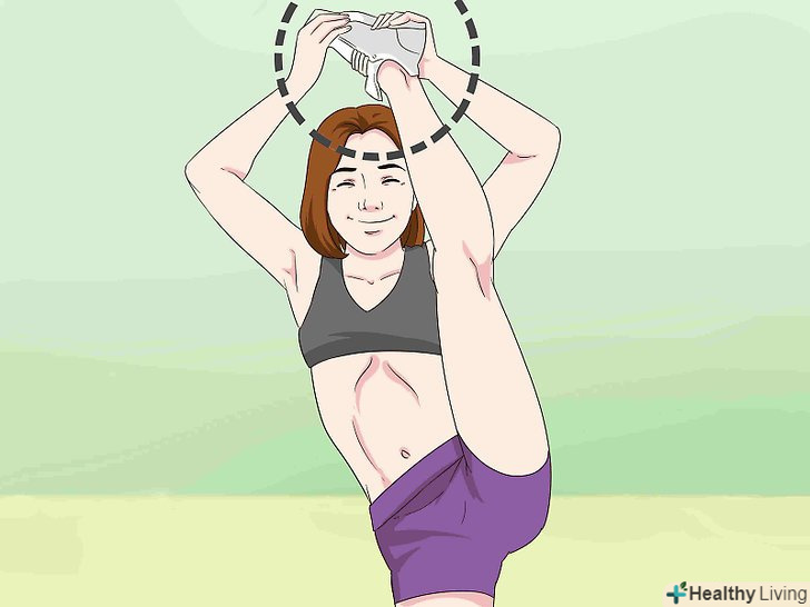 Схопіть ногу рукою за п'яту. якщо піднімаєте ліву ногу, візьміться за неї лівою рукою, якщо праву - правою рукою.- Більшості новачків не вдасться зробити це з першого разу. Спробуйте спочатку взятися за п'яту рукою, розпрямити ногу і підняти її вгору. Повторюйте до тих пір, поки не відпрацюєте прийом.