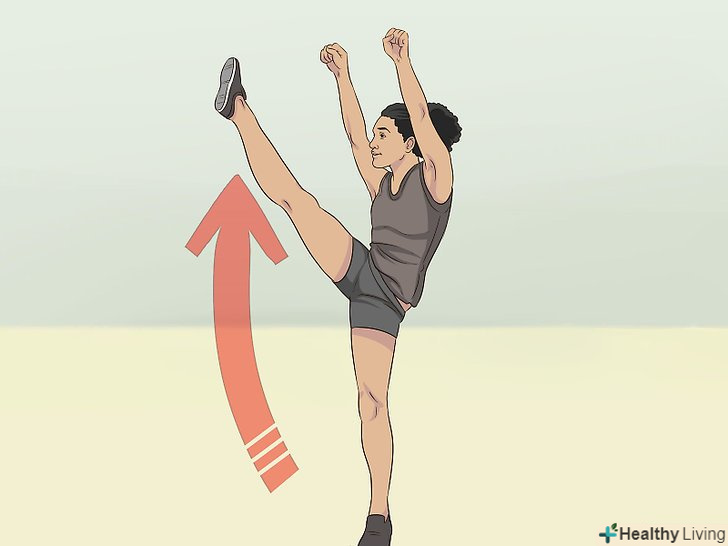 Поробіть махи тією ногою, яка буде в повітрі. це розігріє і розтягне м'язи і підготує їх до різких махів вгору.- Помахайте ногою вперед і назад, як ніби відбиваєте м'яч. [2]