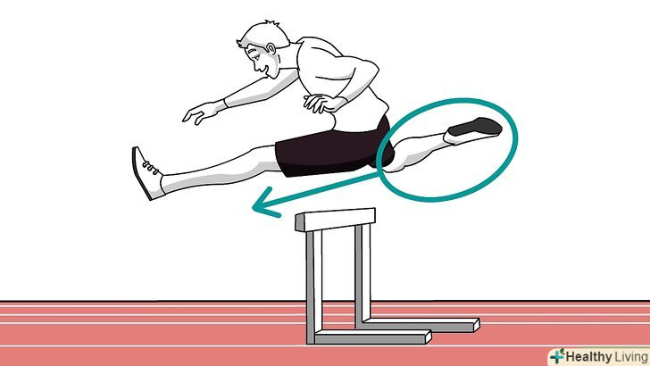 ' підніміть ногу, яка все ще на землі (толчковая нога), нехай стегна будуть паралельно поперечної Балці на бар'єрі. підніміть ногу на рівень пахв, перекиньте і продовжите бігти, як тільки потрапите на землю.- Продовжуйте бігти, намагаючись до кінця набрати швидкість. Пройти останній бар'єр може бути важко, і якщо ви занадто на себе тиснете, це не буде проблемою, проте в кінці може стати боляче.