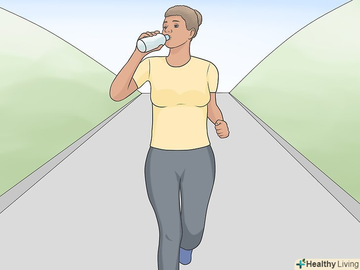 Під час бігу пийте воду в помірних кількостях. звичайно, в процесі важливо підтримувати водний баланс, проте варто поповнити його ще до початку забігу. Уповільнення темпу або зупинка ковтка води можуть вплинути на кінцевий результат, а повний шлунок води може викликати нудоту. [14]- Якщо ви відчуєте слабкість або запаморочення, випийте трохи води, щоб уникнути зневоднення.