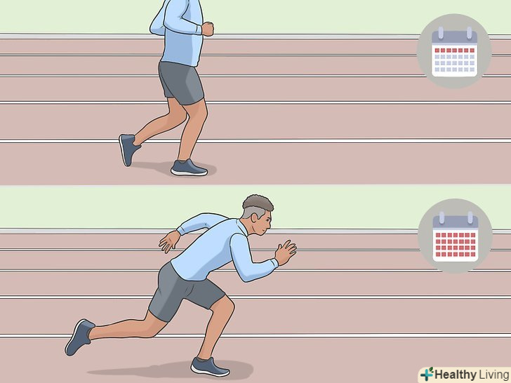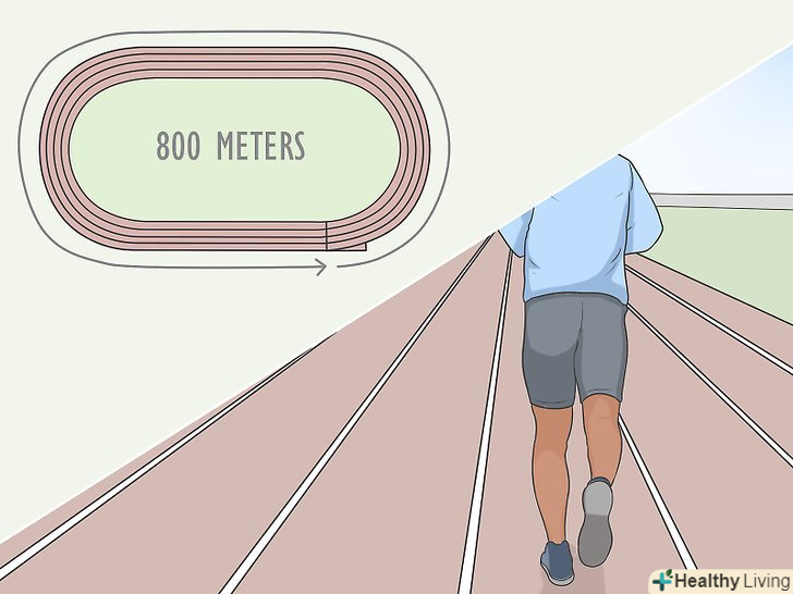 Скорочуйте час для відпочинку щотижня протягом 4 тижнів, щоб зміцнити витривалість. Зберігайте той же темп (3 хвилини 10 секунд) для кожних 2 кіл (800 метрів), які ви пробігаєте по біговій доріжці, проте щотижня скорочуйте час для відпочинку. Так вам буде простіше підтримувати цей темп, не втомлюючись і не сповільнюючись. [7]- Протягом першого тижня не поспішаючи пробігайте підтюпцем 200 метрів або половину кола між підходами.