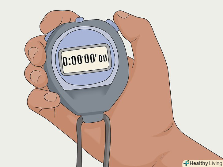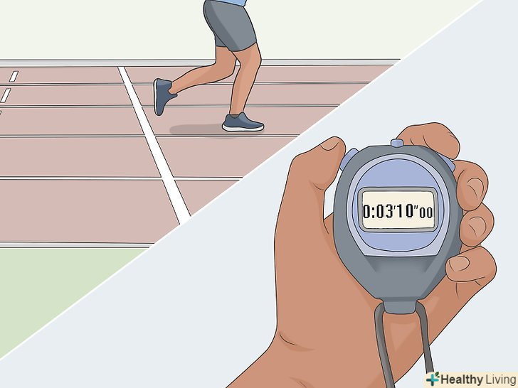 Заміряйте темп, з яким ви проходите кожне коло. використовуйте годинник, телефон або секундомір, щоб засікти час, за який ви пробігаєте перші 2 кола по біговій доріжці. Пробігши два кола, зупиніть таймер і запишіть, скільки часу вам потрібно. [4]- Можна купити секундомір в магазині спортивних товарів, в торговому центрі або в Інтернеті.