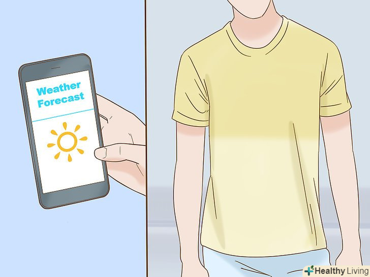 Перевірте прогноз погоди на день змагань і одягніться відповідним чином. якщо буде холодно, надіньте кілька шарів одягу, які можна буде зняти при необхідності. У жарку погоду використовуйте дихаючу легкий одяг світлого кольору. [17]- Використовуйте одяг з вологовідвідними властивостями, особливо якщо на вулиці досить прохолодно. Уникайте таких тканин, які вбирають в себе вологу, наприклад бавовни. Мокрий одяг в холодну погоду може стати причиною застуди.