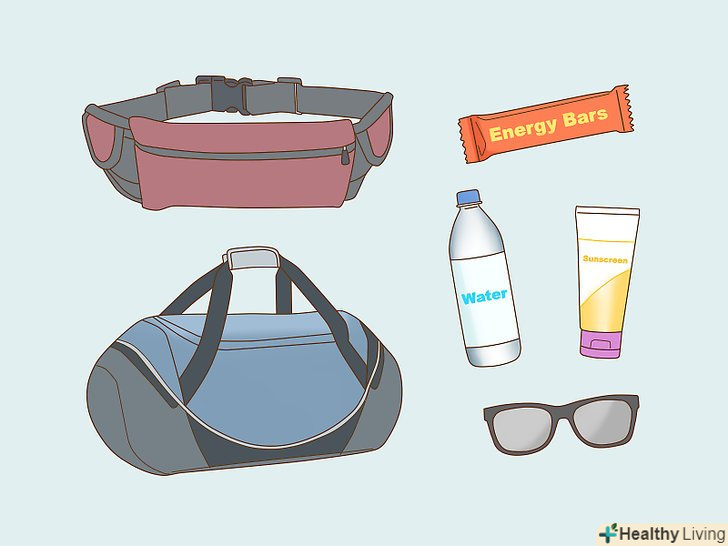 Зберіть поясну сумку бігуна, а також сумку або рюкзак з усім необхідним. напередодні змагань приготуйте енергетичні батончики або гелі, воду, сонцезахисний засіб, фітнес-браслет (якщо користуєтеся ним), сонячні окуляри, зміну одягу і будь-які інші важливі речі, щоб позбавити себе від таких турбот у важливий день. Упакуйте в поясну сумку ті речі, які вам буде потрібно безпосередньо під час бігу, наприклад фітнес-браслет і енергетичні батончики. Ті речі, які знадобляться вам перед забігом або після марафону, упакуйте в звичайну сумку або рюкзак. [18]- При необхідності домовтеся з другом або родичем, щоб він потримав ваші речі, поки ви будете брати участь в забігу.