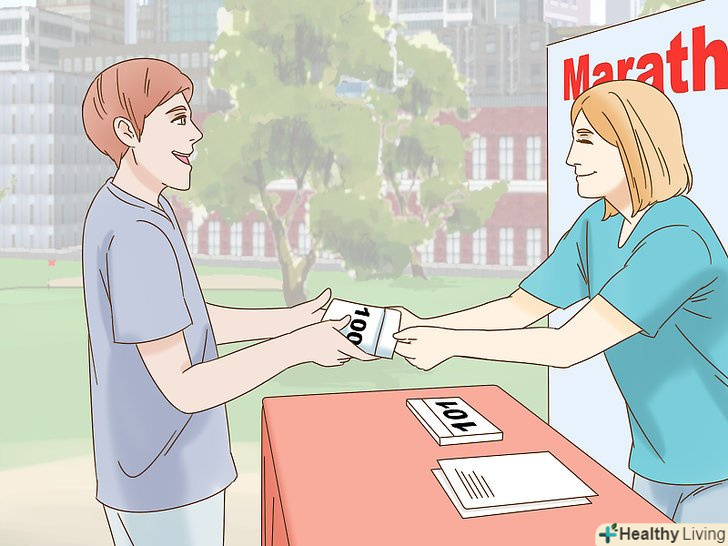 Рада: тренуйтеся пити зі склянки або пляшки під час бігу. Крім того, з'ясуйте, які напої будуть надані бігунам в день марафону (наприклад, це можуть бути спортивні напої з певним смаком). Пийте саме такий напій під час тренувань, щоб звикнути до нього. [14]