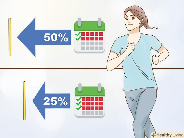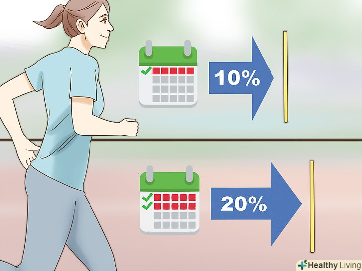 - Приблизно щомісяця влаштовуйте собі перепочинок і пробігайте ту дистанцію, з якої Ви починали тренування в перший тиждень. Вашому тілу знадобиться додаткова можливість для відновлення в міру збільшення того часу, який ви проводите на ногах. [7]