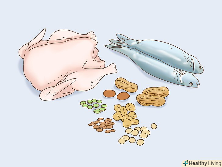 Вживайте не менше 110-170 г білка в день. віддавайте перевагу джерелам пісного білка, включаючи птицю, рибу і бобові. В якості загального правила, бігунам потрібно приблизно 1,5 г білка на кілограм ваги. [12]- Наприклад, бігуну з вагою 77 кг потрібно 119 г білка в день. Дану потребу задовольнить порція курячої грудки вагою в 170 г, 140 г м'яса лосося, 1 стакан сої на пару або 2 великих курячих яйця.