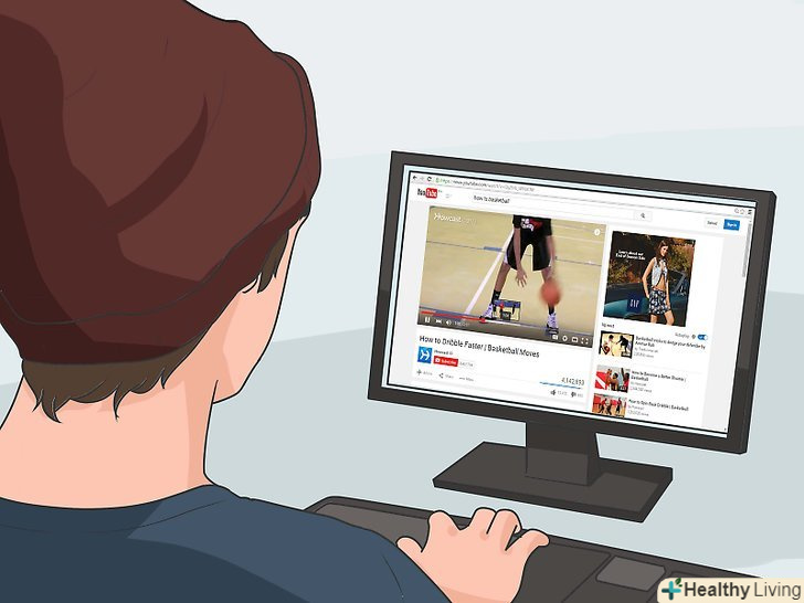 Вчіться вести м'яч. деякі експерти стверджують, що вміння вести м'яч —практично найважливіший навик в грі. Втім, вам, мабуть, нема чого замислюватися про ведення м'яча, якщо ви часто тренуєтеся. Хороший спосіб поліпшити даний навик - це тренування на ведення м'яча (дриблінг).- Практикуйте ведення м'яча по колу. У цьому тренуванні використовуйте одну руку, щоб вести м'яч по колу навколо вашої правої ступні. Потім міняйте руку і ногу. Практикуйте дриблінг між конусами або стільцями.