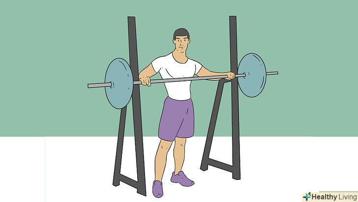 - Робіть присідання з вагою. поставте ноги по ширині стегон. Підніміть штангу до плечей і обіпріть снаряд (або снаряди) на плечі. Присядьте так низько, як тільки зможете, утримуючи вагу в правильному положенні. Потім поверніться в положення стоячи. [12]