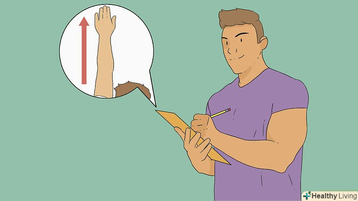 Виміряйте висоту стрибка. Встаньте біля стіни або високого жердини і витягніть руку якомога вище. Попросіть друга відзначити точку, до якої дотягується ваша рука (нехай він поставить мітку крейдою або іншим пишучим предметом). Потім підстрибніть все так же з піднятою рукою, а одного попросіть постаратися відзначити точку, в якій ваші пальці торкнулися стіни вгорі. Визначте відстань між двома точками. Це і буде поточна висота вашого стрибка. [14]- Спробуйте намочити пальці або обмазати їх крейдою, щоб ви самі могли залишити мітки на стіні і полегшити процес вимірювання висоти стрибка.