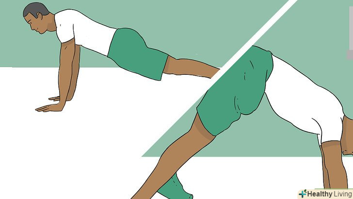 - Виконуйте болгарські Спліт-присідання. Встаньте на деякій відстані від лави або стільця (спиною до неї або до нього) і покладіть одну ногу на сидіння так, щоб стопа дивилася вгору. Опустіть тіло вниз до тих пір, поки коліно відведеної назад ноги майже не торкнеться підлоги, а потім виштовхніть себе вгору за допомогою п'яти стоїть попереду ноги. У цьому полягає один підхід вправи. [7]