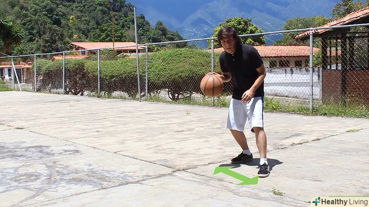 Станьте з м'ячем у вашій домінуючій руці і зробіть хороший крок протилежною ногою вперед іншої ноги під кутом 45 градусів до іншої частини вашого тіла. переконайтеся, що ваші ноги зігнуті і досить далеко один від одного, щоб прокинути м'яч між ними.- Штовхніть м'яч для відскоку в сторону, яка відповідає вашій домінуючій руці, і направте його між вашими ногами.