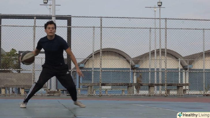 - Під час дриблінгу перекиньте м'яч на праву руку. Потім, коли м'яч буде в руці, різко переведіть його в ліву руку. [1]