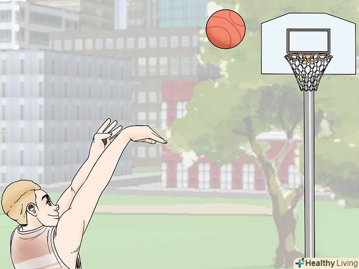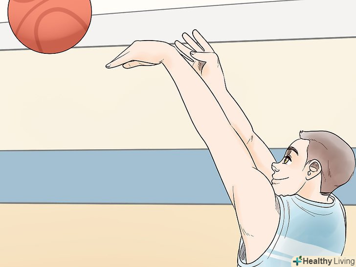 Випустіть м'яч і проводжайте його до кінця. досягнувши найвищої точки стрибка, відпустіть м'яч, згинаючи кисть вниз. М'яч повинен злетіти з вашої руки, торкаючись вашого вказівного пальця в останню чергу. У цей момент ваша кидаюча рука і кисть повинні виглядати так, немов ви намагаєтеся дістати банку печива з верхньої полиці. Після того як ви відпустили м'яч, ваша рука повинна природним чином опуститися, пригніть ваші коліна і стегна, коли торкнетеся землі і приготуйтеся зробити підбір, якщо промахнетеся!- Намагайтеся звикнути відпускати м'яч в самій верхній точці вашого стрибка. Навіть якщо ви вмієте кидати раніше або пізніше, це може зробити ваші кидки смикатися або неточними. [6] до того ж, кидок м'яча в самій верхній точці стрибка дає вам перевагу — бо захисникам складніше заблокувати вас, коли ви високо в повітрі. [7]