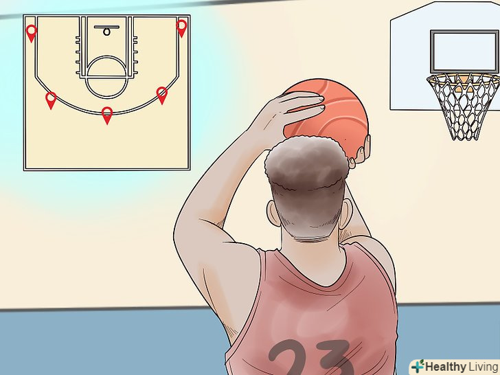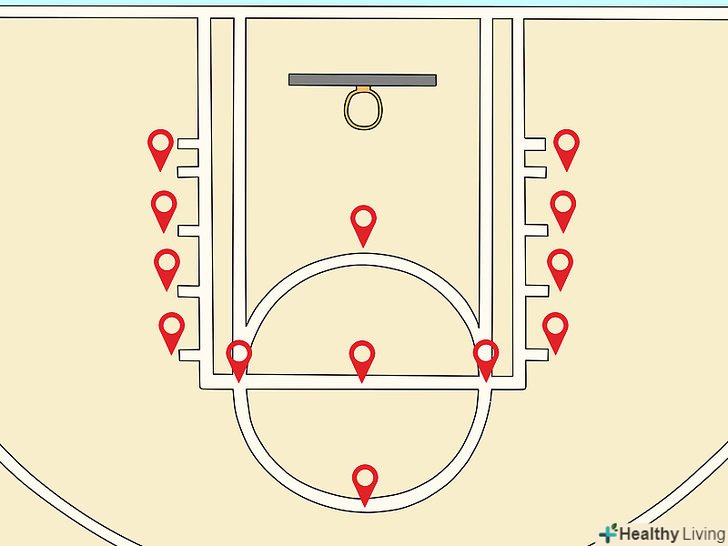 Почніть кидати по периметру кільця. звичайно, в справжній грі в баскетбол, кидати по кільцю буде складно, і ви не будете безперешкодно кидати в стрибку зі штрафної лінії або з флангів — завдання захисників в тому, щоб вам перешкодити. Щоб стати більш універсальним снайпером, почніть здійснювати кидки з будь-яких позицій на полі. Незабаром ви зрозумієте, що з одних позицій кидати набагато легше, ніж з інших, однак щоб стати дійсно результативним снайпером, вам потрібно вміти кидати по кільцю з будь-яких позицій, тому тренуйтеся цим хитрим кидкам!- В цілому, звичайно, вам захочеться вміти кидати з будь-якої позиції всередині триочкової зони, а в ідеалі, і за нею. Вам практично ніколи не потрібно буде кидати з дистанції, далі, ніж з півметра від триочкової лінії під час гри, тому немає необхідності хвилюватися про те, щоб потрапляти з півполя.