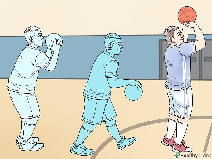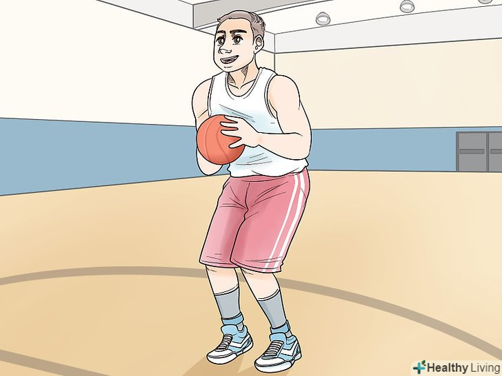 Твердо займіть позицію для кидка. Як не дивно, але ваша позиція ніг і нижня частина тіла можуть значно вплинути на точність ваших кидків, незважаючи на те, що ви навіть не використовуєте їх безпосередньо при кидку м'яча. [1] для того щоб встати в позицію для кидка, зведіть ноги разом і розводите вашу пасивну ногу (ту, що протилежна вашій провідній руці) в сторону, поки ноги не опиняться на ширині плечей. Зігніть трохи коліна і стегна, щоб надати собі гнучкості, необхідної для потужного стрибка.- Позиція ніг на ширині плечей дуже важлива для вашого балансу і швидкості кидків. Зведіть ноги разом, і відразу відчуєте складність при підтримці свого балансу при кидку; сильно розставите ноги і не зможете потужно відштовхнутися при стрибку, або швидко реагувати на те, що відбувається на майданчику. [2]