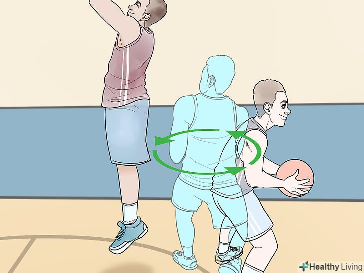 Тренуйте кидки з розворотом. що ви будете робити, коли отримаєте пас, а відразу за вами буде знаходитися захисник, що блокує вам шлях до кільця? Один із способів вийти з такої ситуації – використовувати техніку кидка з розворотом. При використанні цього кидка, гравець з м'ячем показує, що рухається в одному напрямку, потім крутиться в іншу сторону і кидає по кільцю як тільки побачить його. Практично завжди це дасть йому невеликий проміжок, при якому він може кинути без блокування захисника.- Щоб зробити кидок з розворотом, почніть з позиції спиною до кільця і одному захиснику, який опікує вас за Вашою спиною. Рухайтеся спиною до кільця, при цьому ведучи м'яч в полуприсевшей позі, поки не підійдете на зручну для кидка дистанцію. Зробіть крок у бік вашої кидаючої руки, трохи відступаючи вашої веденої ногою. Швидко розверніться навколо вашої веденої ноги і різко зробіть кидок в стрибку.