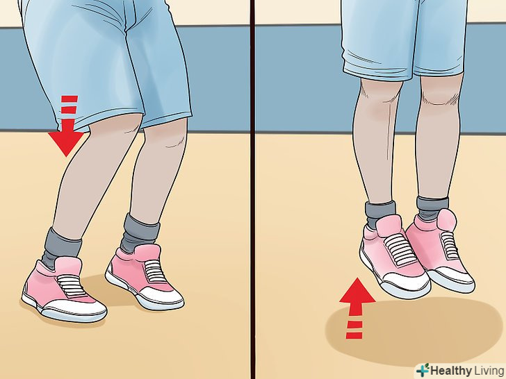 Присядьте, а потім вистрибніть! згинайте ваші коліна і стегна, поки ваша стійка не буде виглядати так, немов ви сідаєте. Виштовхуйте себе своїми стегнами і ногами вгору. Чим нижче ви присядете, тим потужніше буде ваш стрибок. Одна з найпоширеніших помилок у новачків полягає в тому, що вони кидають зі стійки в повний зріст — а насправді, вони повинні випрямлятися тільки в тому випадку, коли відштовхуються від землі, а не до стрибка.- Для найбільшої точності, тримайте при присіданні лікоть вашої кидаючої руки ближче до свого тіла. В ідеалі, лікоть повинен дивитися в кільце. Якщо ваш лікоть зміститься з напрямку при кидку, це може змінити траєкторію м'яча, тому відразу візьміть собі в звичку цю поправку. [3]