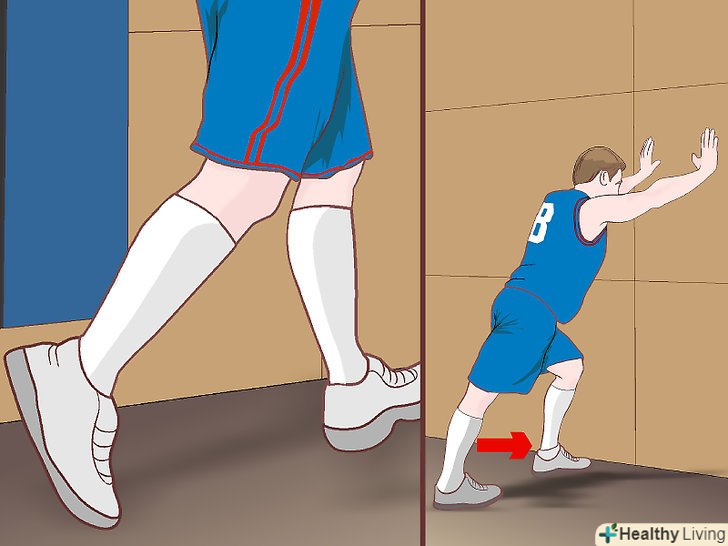 - Розминка ахіллових сухожиль. Станьте рівно і розташуйте ноги нарізно (одна нога попереду, інша ззаду). Нахиліться вперед і упріться долонями в підлогу з двох сторін від висунутої ноги. Випряміть ногу і підніміться в стегнах. Опускайтеся стегнами до підлоги і згинайте висунуту вперед ногу. Виконайте 10 повторень для кожної ноги. [12]
