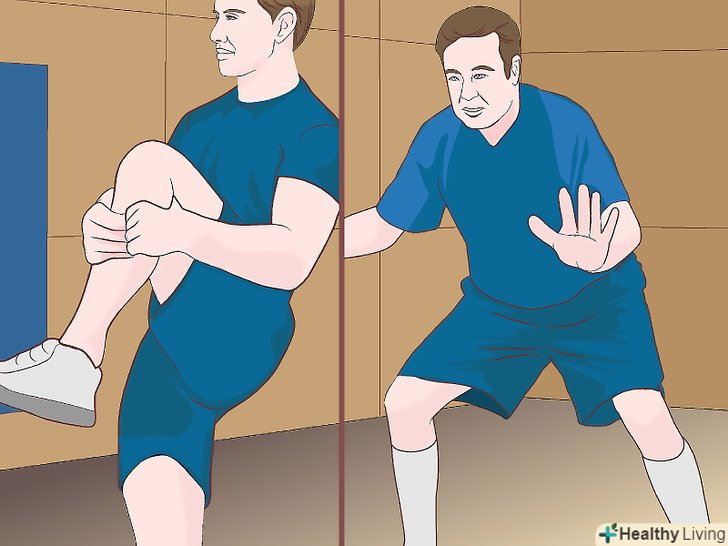 Виконайте динамічну розминку перед виходом на поле. виконайте разом з товаришами по команді серію динамічних вправ перед виходом на поле. Динамічні вправи для розминки підвищують температуру тіла і зберігають еластичність м'язів. Їх потрібно виконувати в залі або коридорі з короткою перервою між кожною вправою. Приклади динамічних вправ для розминки:- Коліна вгору: під час ходьби, бігу або стрибків на місці тягніть коліна вгору до грудної клітки. Не нахиляйтеся в стегнах і тримайте спину рівно.