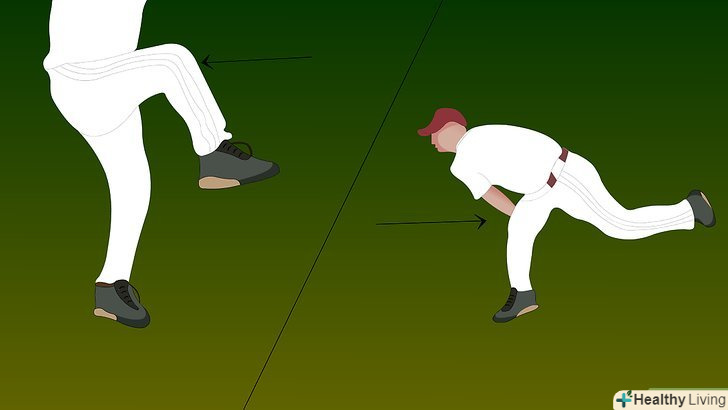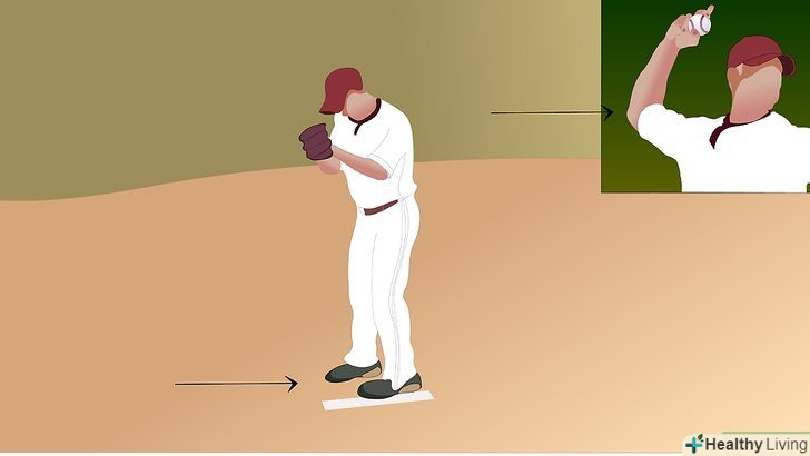 Приховайте свою хитрість. знову переконайтеся, що ваш захоплення не видно суперникам, приховайте рукавичкою м'яч до замаху. В іншому випадку, нападник буде попереджений про вашому крученому, і навряд чи ви отримаєте бажаний результат.- Замахніться і кидайте. поставте провідну ногу на гуму, в паралельному положенні. Підніміть протилежне коліно і перемістіть стегно вперед для кидка. Ваш лікоть повинен бути на одному рівні або вище вашої руки і зігнутий під кутом 90 градусів. Замахуйтеся м'ячем так, як ви це робите при кидку фастболу.
