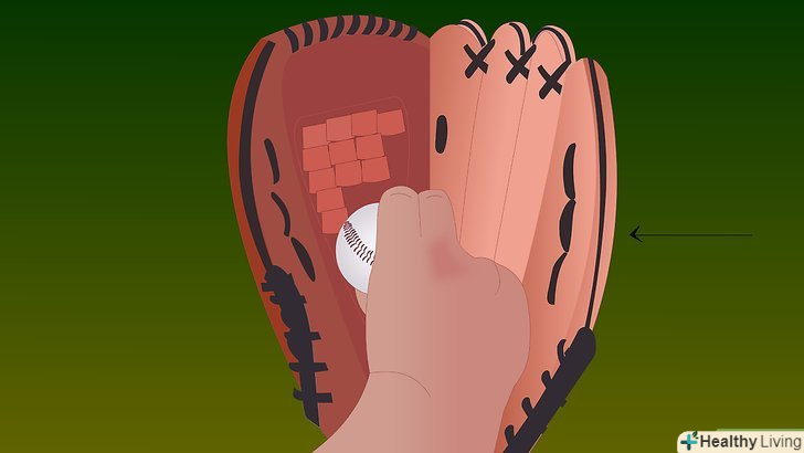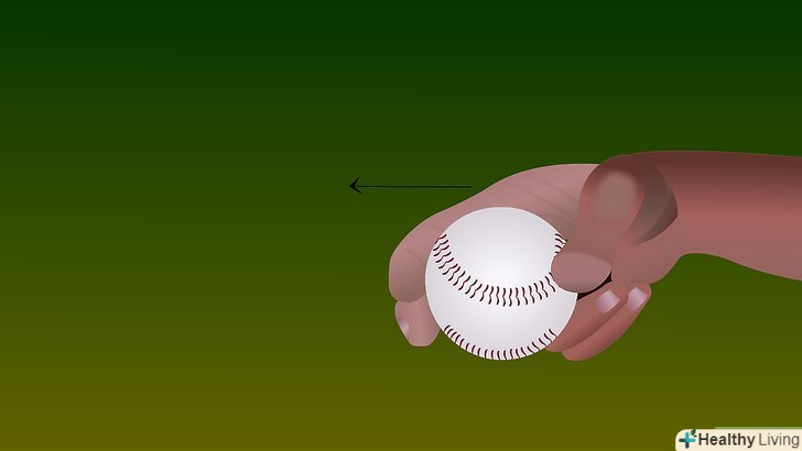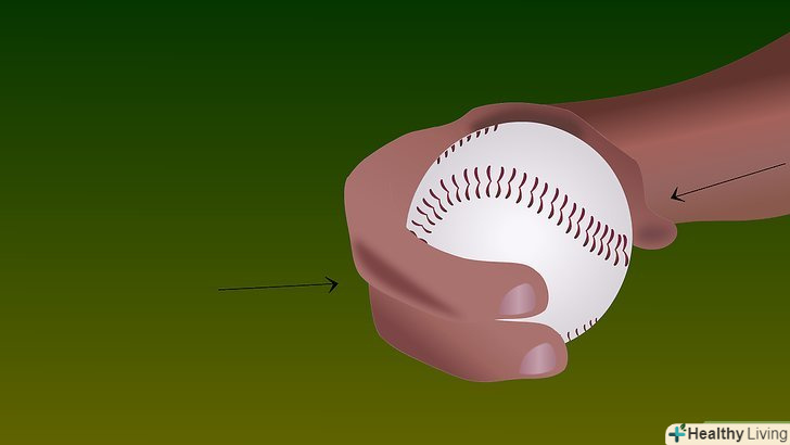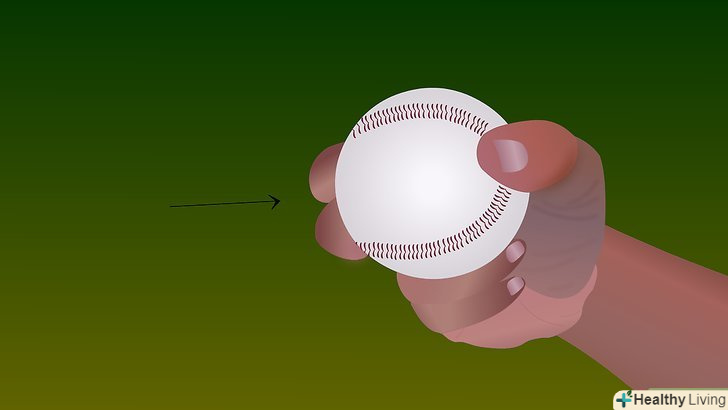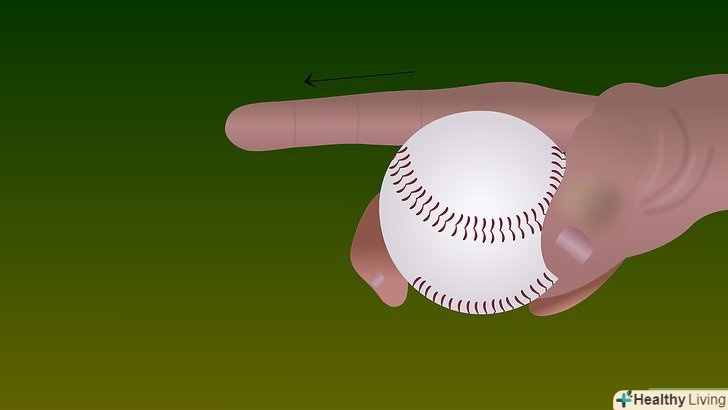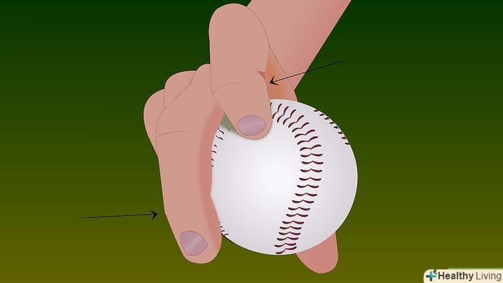 Візьміть м'яч між великим і вказівним пальцями. поставте середній палець уздовж нижнього шва бейсбольного м'яча і пальцем уздовж заднього шва. Відставте свій вказівний палець від м'яча. Замість того, щоб захоплювати їм м'яч, ви будете використовувати його, щоб вказувати на мету польоту м'яча. [1]- Тримайте м'яч так, щоб шви були близько до вашої долоні, один вгорі другий внизу.