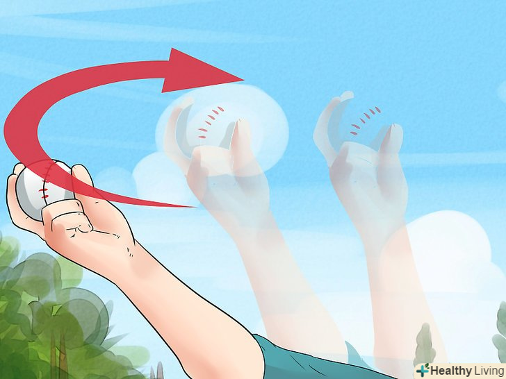 Кидайте м'яч, як би клацаючи великим і середнім пальцями. при крученому кидку розпрямляйте зап'ясті назад. Коли відпускаєте м'яч," клацніть " великим і середнім пальцями, роблячи замах зап'ястям. [10] на цьому етапі ваш середній палець повинен обертатися вниз, а великий палець вгору, щоб створити доцентрову силу, необхідну для кидка м'яча у напрямку до пластини. [11] [12]- Робіть кручений кидок зі змінною швидкістю, збільшуючи глибину захоплення. [13]