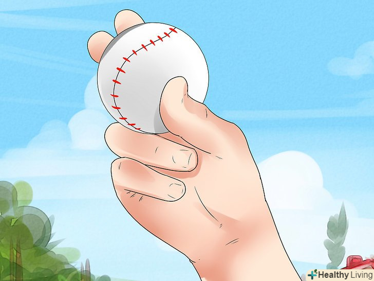 Підготуйтеся до кидка м'яча. переконайтеся, що ваш вказівний палець розслаблений і піднятий вгору, м'яч міцно стиснуть великим (внизу) і середнім (вгорі) пальцями. Ваше захоплення повинно бути міцним, але розслабте м'язи зап'ястя і передпліччя. [18]